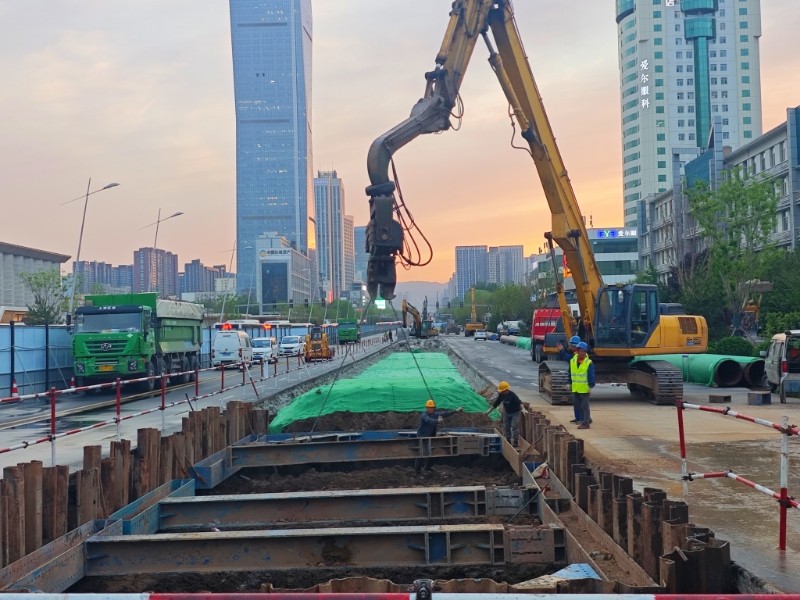 “追求精細(xì)極致,鑄就基坑支護(hù)的穩(wěn)固防線”。項目部將鋼板樁施打質(zhì)量視為確?;影踩c質(zhì)量的關(guān)鍵環(huán)節(jié),嚴(yán)格執(zhí)行材料準(zhǔn)入制度,所有進(jìn)場鋼板樁均經(jīng)過材質(zhì)證明核查、尺寸精度測量和外觀質(zhì)量檢驗三重把關(guān),確保樁身無裂紋、無銹蝕等質(zhì)量缺陷,從源頭上杜絕不合格材料。施工中,施工人員采用全站儀進(jìn)行動態(tài)監(jiān)測,嚴(yán)格控制樁身垂直度偏差在規(guī)定范圍內(nèi),詳細(xì)記錄每根樁的打入深度、貫入度等關(guān)鍵參數(shù)。拔樁階段采用專用施工設(shè)備,按照“先支后拆、分段拔除”的原則有序進(jìn)行,拔樁后出現(xiàn)的孔隙立即灌砂,最大限度減少對周邊土體的擾動,實現(xiàn)平穩(wěn)施工與環(huán)境保護(hù)的和諧統(tǒng)一。